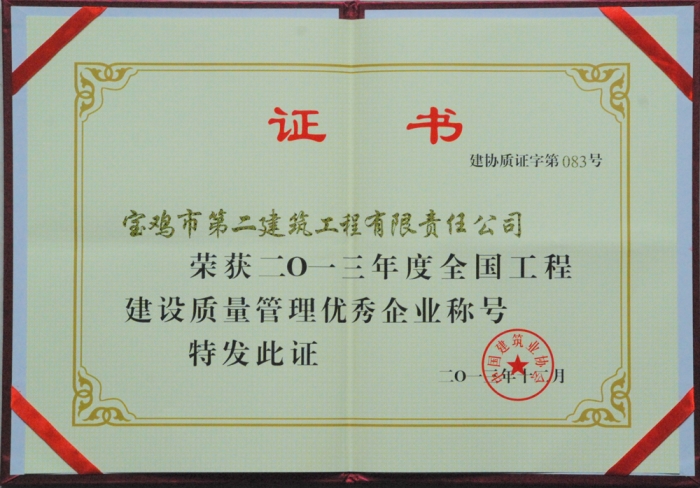 2013年全國工程建設質量管理優(yōu)秀企業(yè)